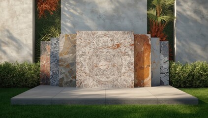 Outdoor display of stone sheets highlighting durability and weather resistance for commercial use