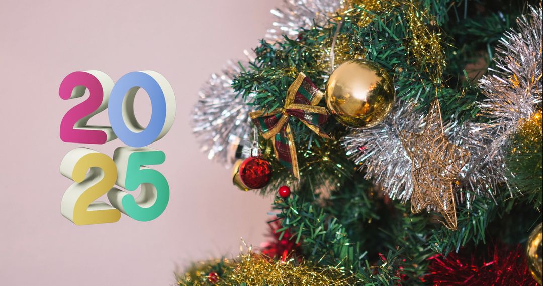 Festive scene showcasing a decorated Christmas tree with vibrant colors and ornaments. Featuring numerals 2025 in pastel hues. Great for holiday greeting cards, festive New Year announcements, and themed celebration invites.