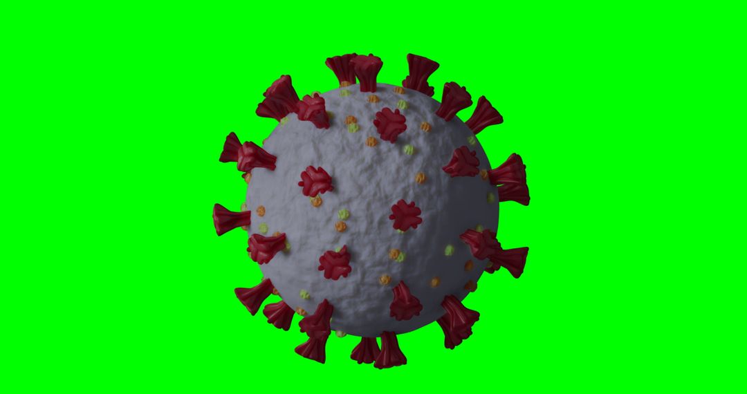 Illustration featuring a detailed 3D model of the coronavirus Covid-19 with a vibrant green screen backdrop. Ideal for medical videos, public health announcements, or educational projects to discuss virus characteristics and pandemic impacts.