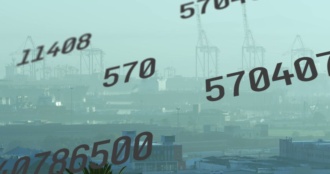 Abstract Digital Numbers Overlay on Cityscape Industrial Skyline Image