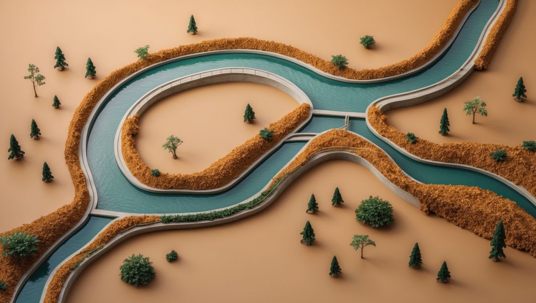 AI Generated Image. Water channels depicted on a beige surface with golden brown hedges dividing pathways. Conifer trees and green shrubs enhance abstraction, offering insights into landscape organization, urban planning, and creative design concepts. Ideal for art displays, architectural portfolios, and creative visual content.