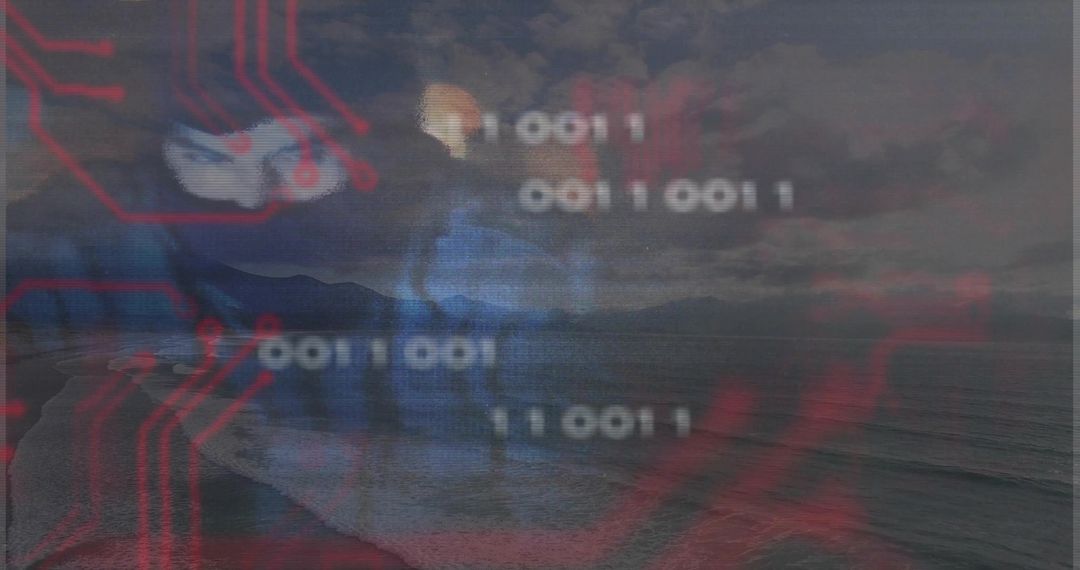 A creative digital art piece features a floating stylized hacker mask superimposed over a picturesque sunset seascape, with red circuit tracings and binary digits prominently displayed. This visual composite highlights themes of cybersecurity and the digital world, along with connectivity and technological innovation. Ideal for use in articles, presentations, and websites focusing on cybersecurity, digital transformation, and technology trends.