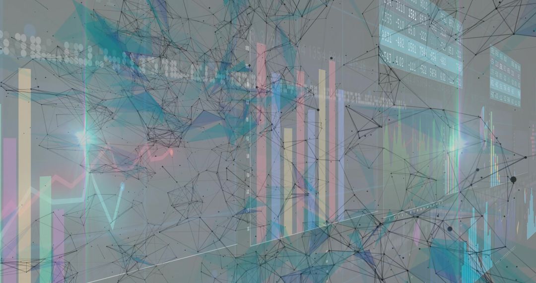 Dynamic nodes and translucent graph lines overlap in digital space, visualizing advanced data analytics. Ideal for technology-focused presentations, backgrounds for tech websites, and visuals emphasizing innovation in information processing.