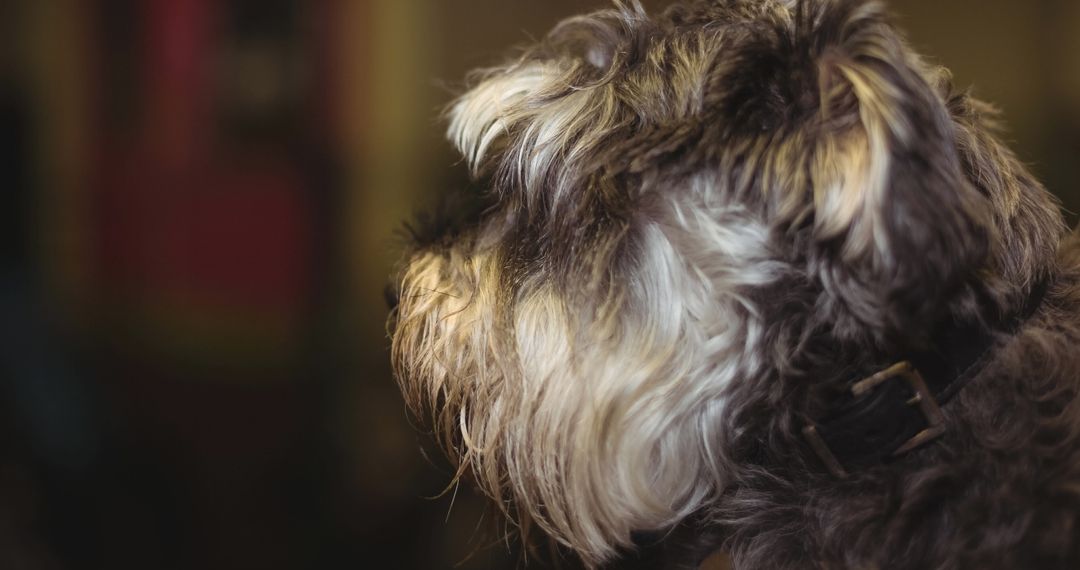This image features a close-up of a schnauzer with long grey and white fur. The dog's focus is directed away from the camera, showcasing its distinctive and textured coat. Perfect for use in pet-related content, animal behavior illustrations, or promoting dog ownership and care materials.