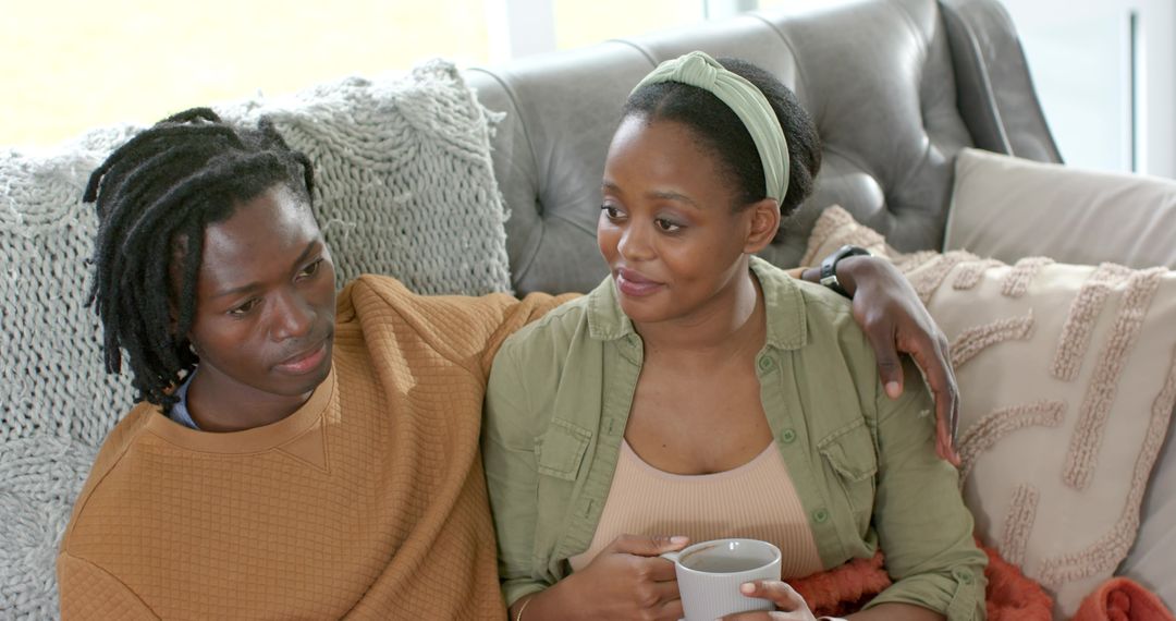 Scene showing African American couple sitting close on tufted gray sofa, woman holding ceramic mug, man wrapping arm around shoulder while gazing thoughtfully. Soft natural light, textured pillows, knit throw creating cozy, intimate mood conveying warmth and connection. Horizontal composition offering ample negative space on right for headline or overlay text, tight crop working well for social media square use. Use for lifestyle campaigns, relationship advice articles, mental health resources, home decor promotions, coffee brand storytelling, dating app creative, diversity and inclusion content. Color palette featuring warm earth tones: camel sweater, olive shirt, neutral gray sofa, cream pillows. Brand-friendly scene suiting editorial and commercial use requiring authentic, calm domestic moment.