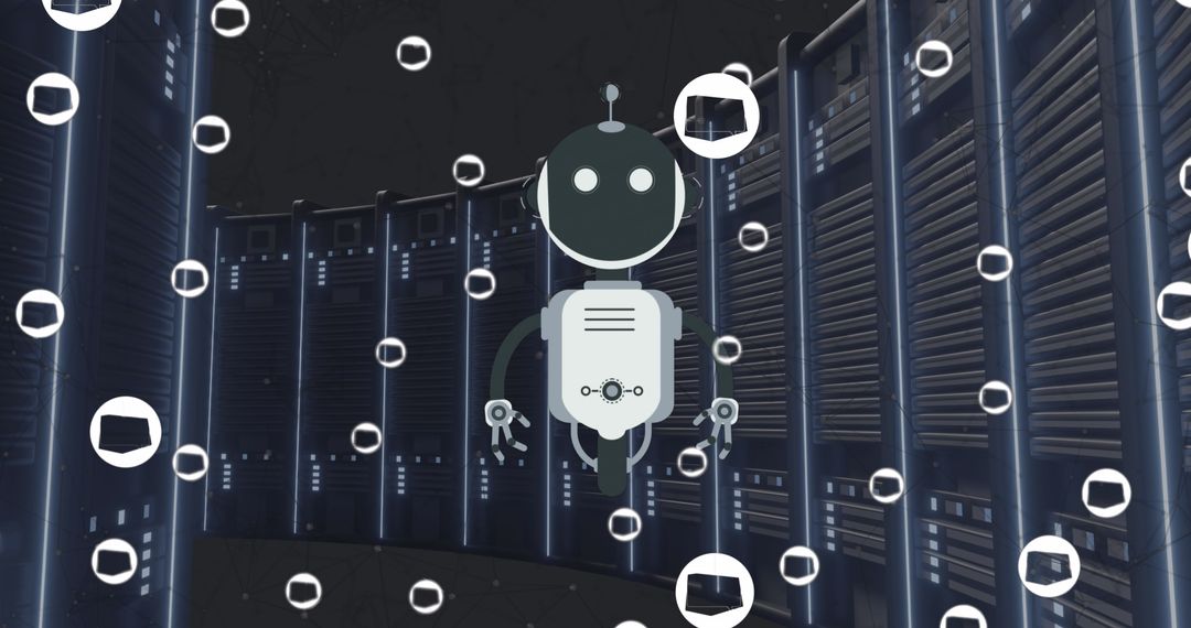 AI chat bot concept displayed with digital communication icons surrounding a server room backdrop. Perfect for illustrating topics on artificial intelligence, machine learning, network interactions, and digital transformation in computing environments. Useful for educational presentations, tech-focused blogs, and marketing materials in the AI industry.