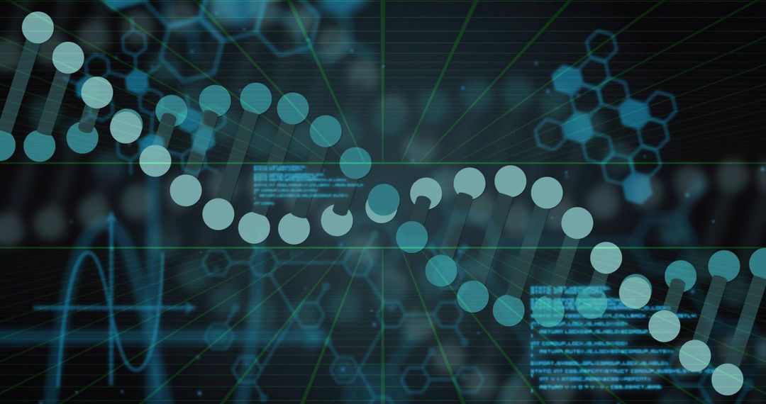 Animating futuristic DNA helix sliding across holographic bio dashboard with neon teal grid Image