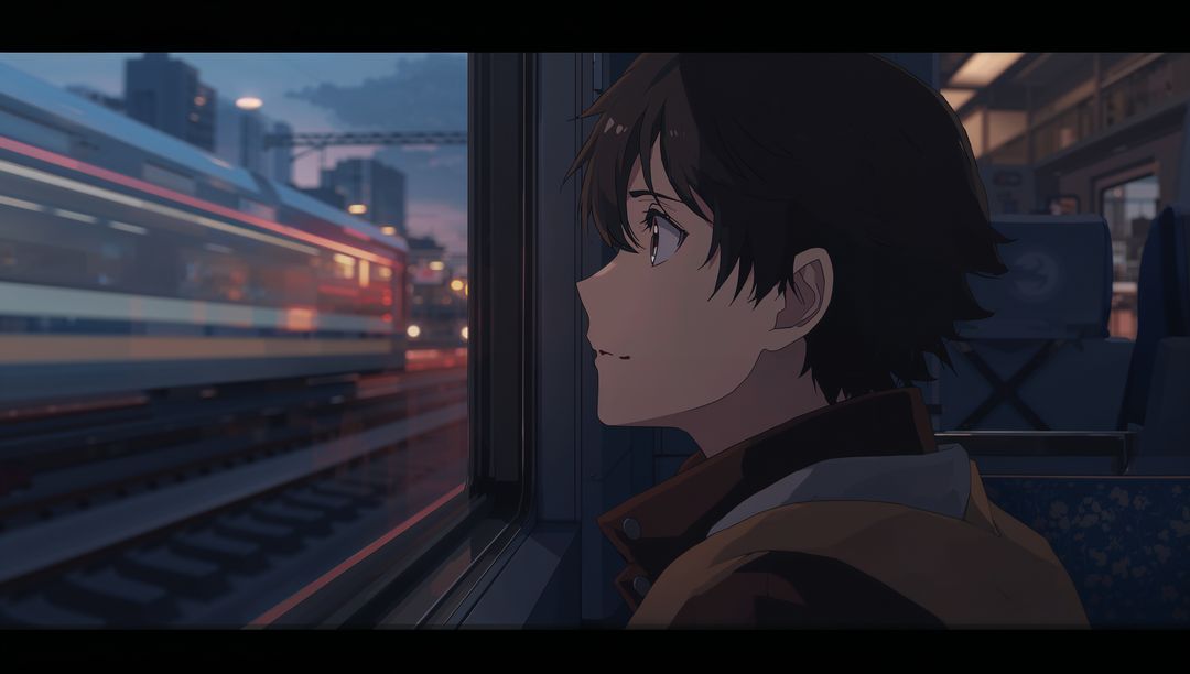 AI Generated Image. Artistic rendering of an Asian teen observing passing trains from a railway carriage captures sense of motion and modern life in an urban landscape. With a reflective ambiance, it conveys themes of contemplation and travel. Serve as visual metaphor for journey, introspection and crossing paths. Ideal for use in storytelling, marketing materials related to travel, urban life or youth in transit settings.
