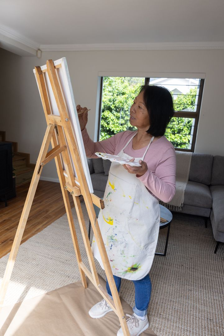 - Asian Woman Standing at Easel Painting Indoors for Creative Expression