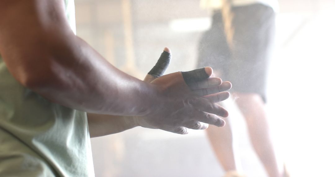 - Athlete Preparing for Workout with Gym Chalk on Hands