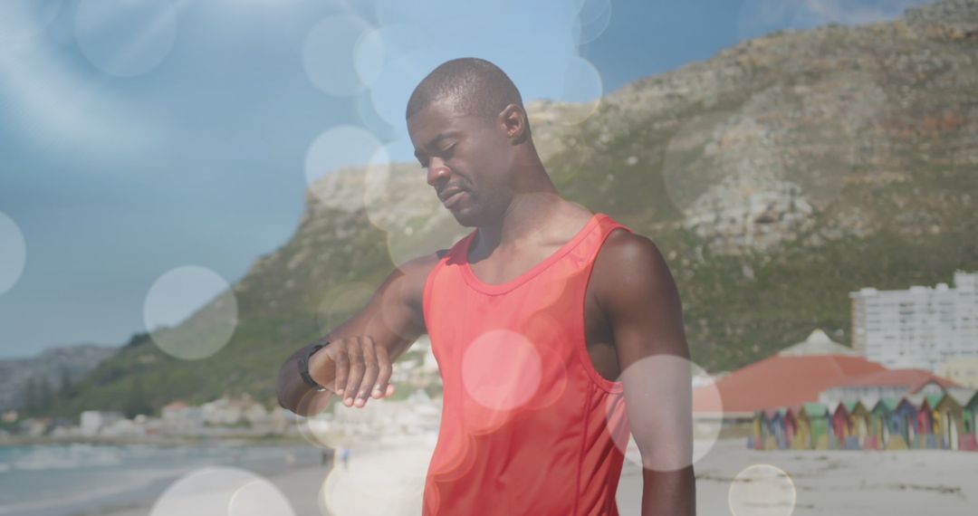 A focused African American man in athletic gear stands on a scenic beach, checking statistics or notifications on his smartwatch. The interplay of natural beauty and technological advancement is accented by glowing, artistic effects. Perfect for promoting sports apps, healthy living, motivational content, wearable technology, and the fusion of nature with modern life.