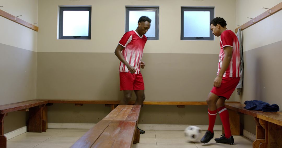 Two male athletes wearing soccer uniforms practicing ball control inside a locker room. Ideal for content on teamwork, discipline, or sports training dynamics. Suitable for promotional materials or articles on athletic skills development.
