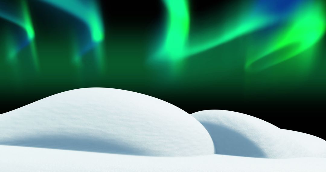 The image shows a picturesque winter landscape with the aurora borealis illuminating the night sky in vibrant shades of green. Snow-covered hills add to the tranquil beauty of the scene. Ideal for illustrating topics related to natural phenomena, Arctic exploration, and winter tourism.