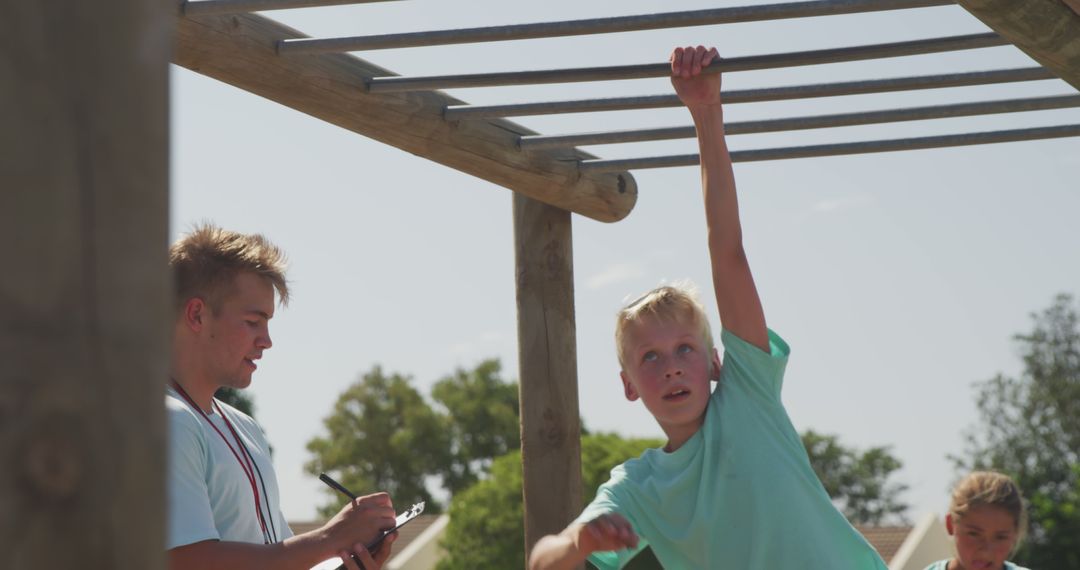 Boy focused and determined while mastering monkey bars, encourages an active lifestyle for children. Male instructor observing and taking notes, ideal for themes on physical education, team building, and personal discipline. Perfect for promoting fitness events, bootcamp programs, or advertisements related to children's athletic training.