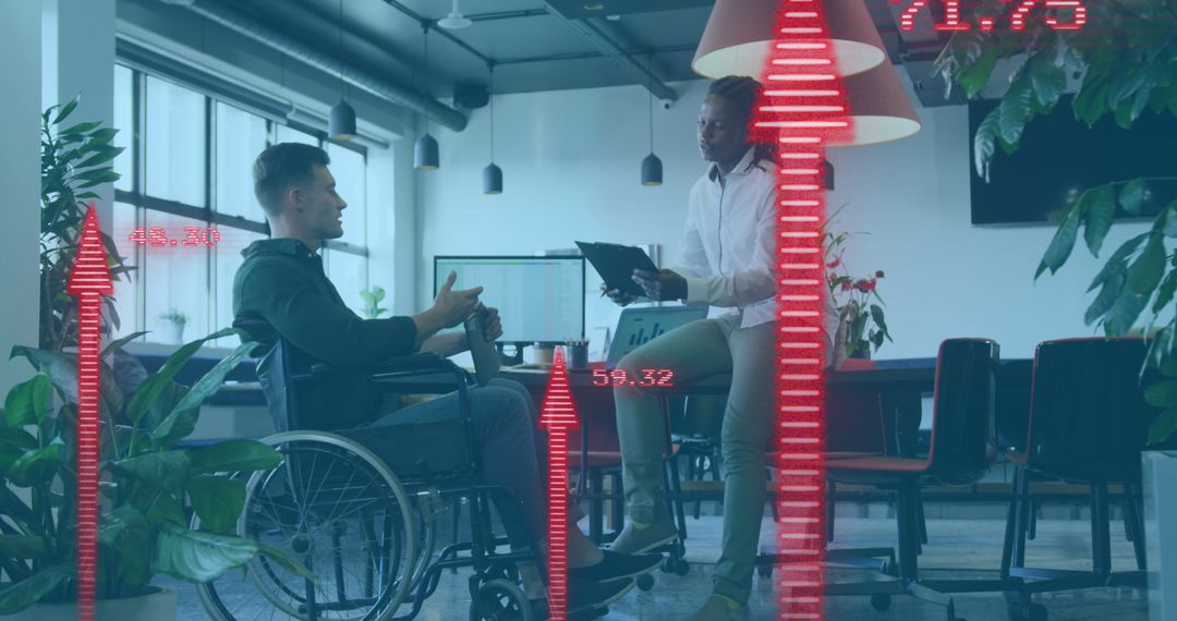 Image highlights an inclusive business environment, showcasing teamwork between diverse members, focusing on handicap accessibility. Captures synergy and open communication in modern office. Arrows and changing numbers symbolize growth and progress. Useful for illustrating themes of inclusive work culture, accessibility in business, and brainstorming pathways for progress.