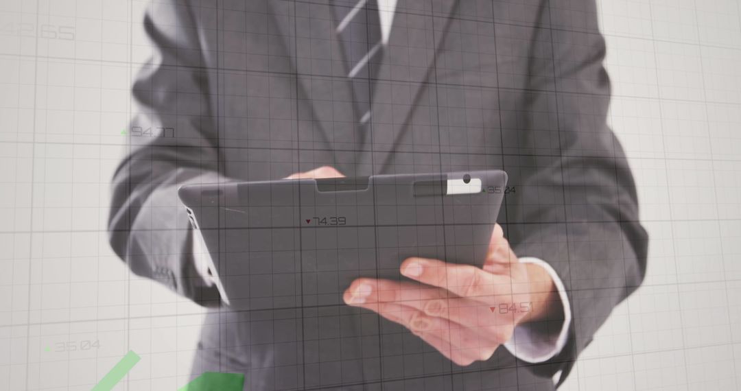 This image shows a business professional wearing a suit and holding a tablet, engaged in analyzing financial data visualized as a growth chart overlay. Ideal for illustrating concepts of business strategy, financial analysis, and modern technology in corporate settings, the image evokes themes of dynamic decision-making and managerial expertise.