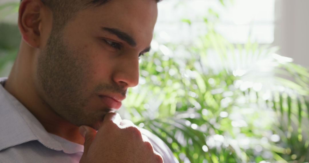A focused business professional is deep in thought in a bright office filled with lush green plants. This workspace, complemented by natural light, enhances productivity and creativity. Ideal for promotions on corporate wellness, productivity boosts, or articles relating to innovative office design.