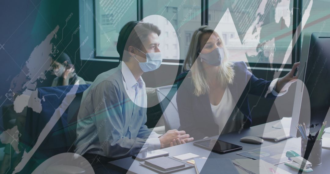 Business professionals wearing masks collaborate in an office while viewing complex digital data projected in the background. These individuals demonstrate teamwork and adaptability during the COVID-19 pandemic. Such imagery can be useful for illustrating topics related to business resilience, pandemic adjustment in workplaces, or data-driven decision making during COVID-19.