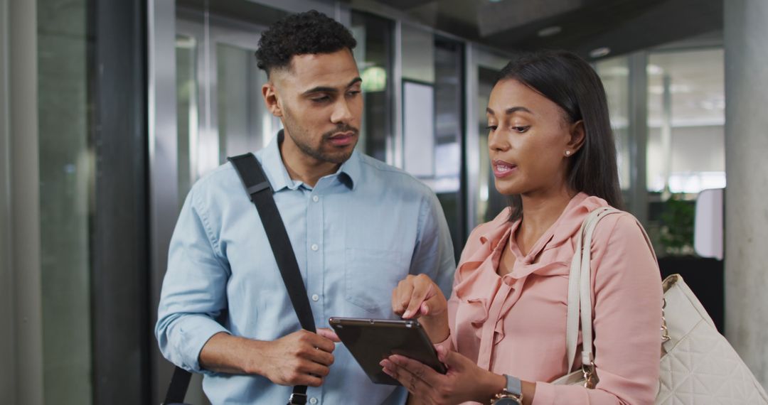 Business colleagues are engaging in a discussion using a tablet, likely focusing on a project or presentation within a modern office environment. Suitable for representing themes of team collaboration, professional development, and business technology integration. Ideal for marketing materials, corporate communications, and workplace dynamism.