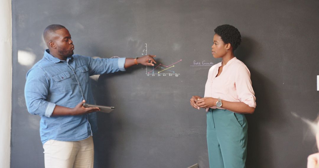 A male and female professional are actively engaging in a discussion in front of a chalkboard displaying various growth charts. The man is pointing at a graph while holding a tablet, possibly sharing insights or strategies, while the woman is listening attentively, suggesting collaboration. Ideal for use in articles or posts about business teamwork, planning sessions, data analysis, or professional collaboration within the corporate sector.