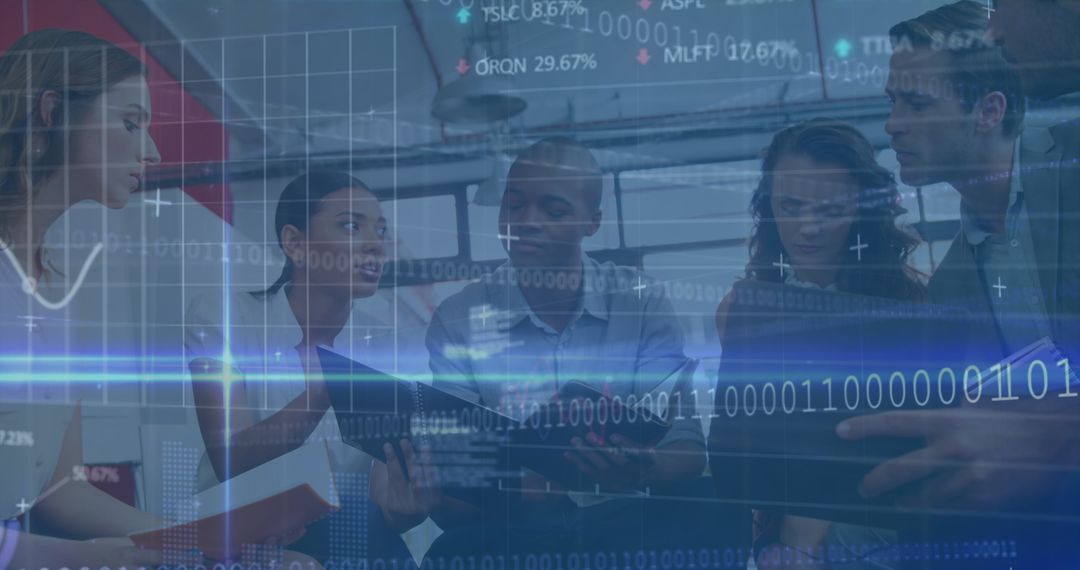 Business professionals engage in collaboration with digital stock market graphics overlaying the scene, symbolizing a blend of teamwork and technology. This multi-ethnic group examines financial data, making it suitable for presentations or articles about collaborative decision-making, financial analysis, or the intersection of technology and finance in modern office environments.