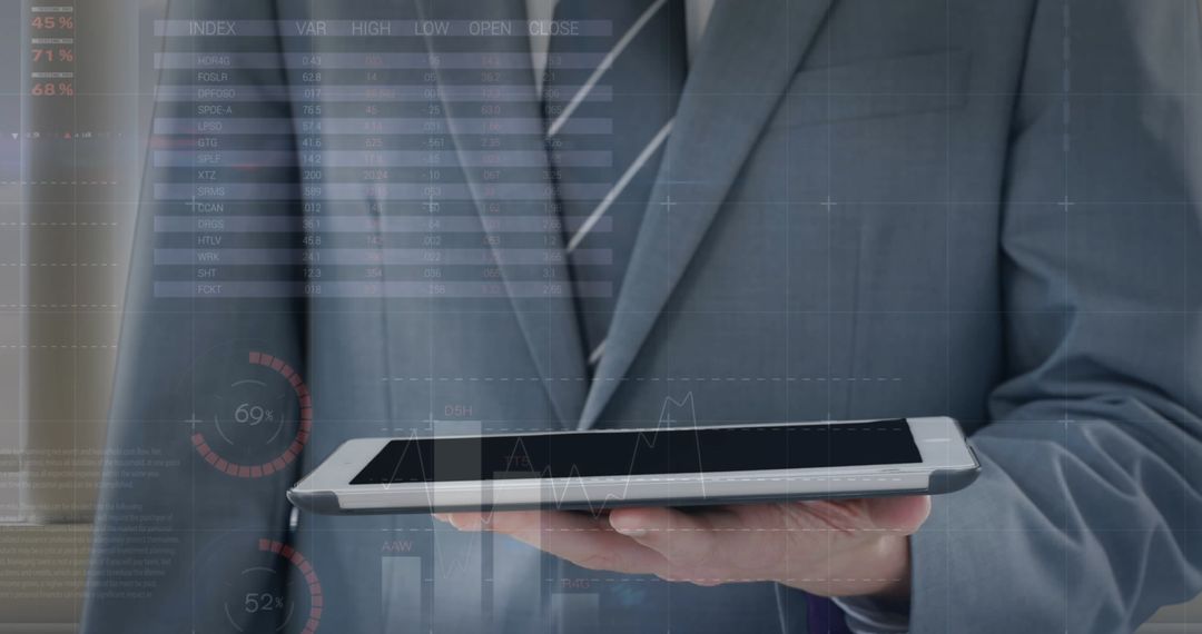 A businessman in a suit reviewing financial data displayed over a tablet interface. Ideal for use in articles or presentations on business technology integration, financial analysis, or digital impact on global economics. The image emphasizes modern business practices and technological advancements.