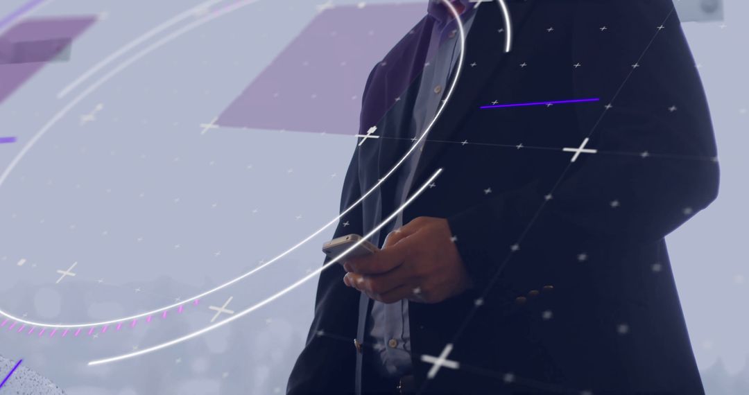 Person in professional attire interacts with smartphone overlaid with futuristic digital graphics, symbolizing concepts of global networking, communication, and innovative technology. Suitable usage includes digital transformation advertising, modern business solutions, and articles about connecting business with technology.