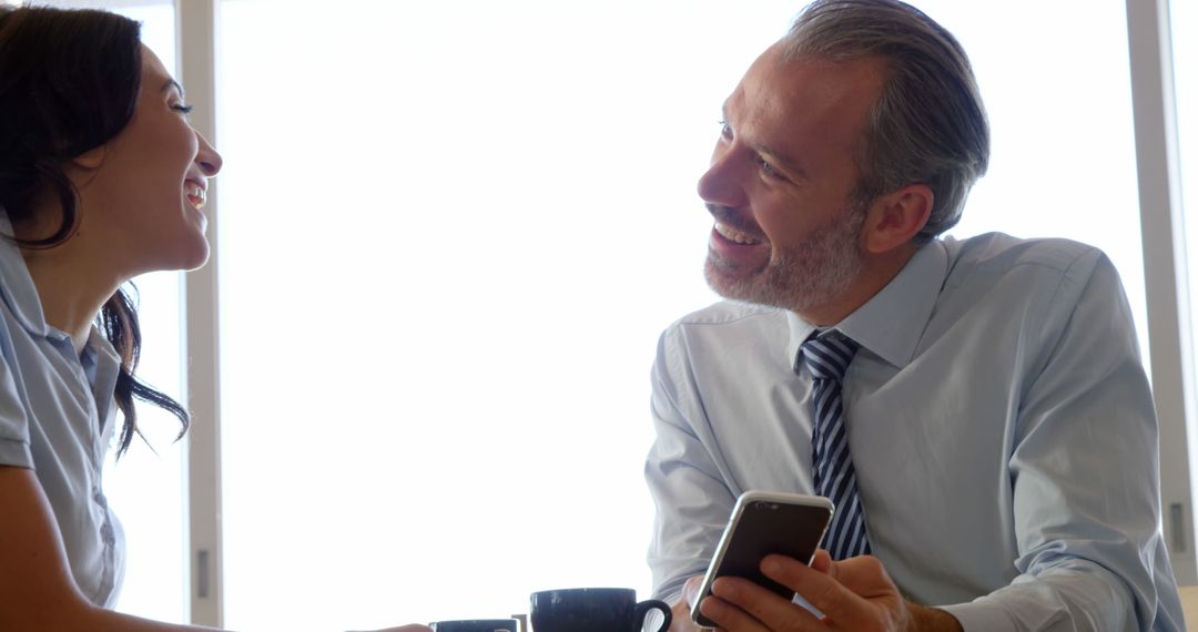 Businessman and a woman sitting by window in restaurant, smiling and using mobile phone for discussion. Scene shows friendly communication, professional collaboration, and positive workplace interaction—suitable for depicting business meetings, collaboration, or workplace diversity.