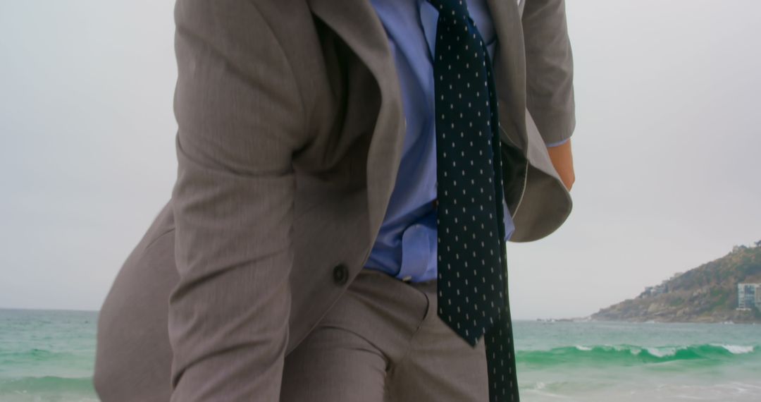 Businessman in a gray suit, accompanied by a briefcase, pictured near the ocean. Ideal for representing work-life balance concepts, promotions related to travel and business retreats, or demonstrating a professional lifestyle in dynamic locations.