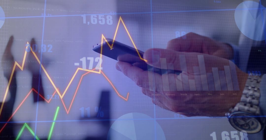 Man viewing financial graphs on smartphone, symbolizing modern investment and data analysis. Perfect for illustrating economic reports, financial advisories, and technology-driven investment strategies.