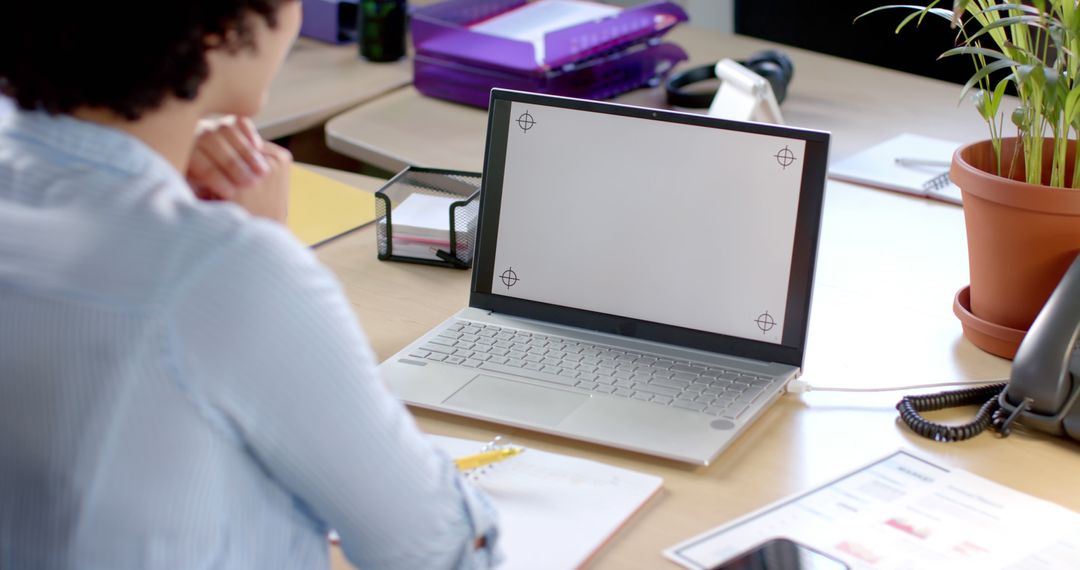 Businesswoman engaged in productivity at her desk in a casual office environment. The laptop's blank screen with copy space makes it ideal for showcasing digital products or presentations. Suitable for promoting remote work solutions, modern office designs, and business productivity tips.