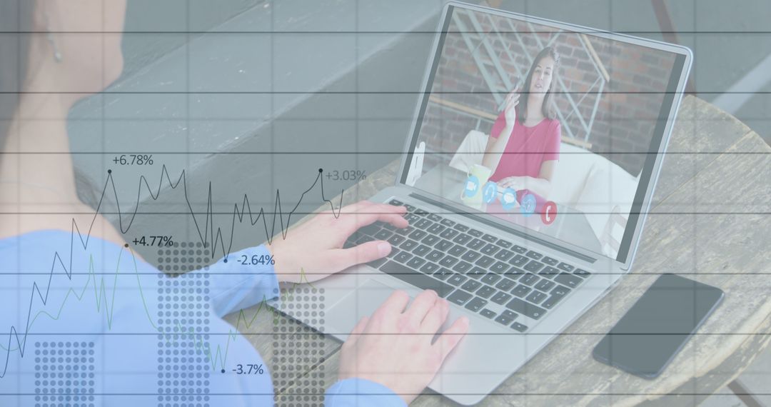 Business concept combining online communication and financial data analysis. Suitable for illustrating remote work, financial strategy discussions, virtual collaboration, and modern business practice in digital landscapes. Highlights the use of technology in conducting effective business meetings and analyzing economic trends.