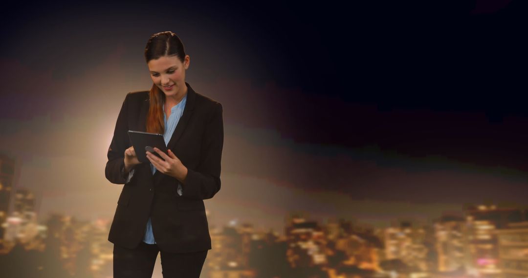 Businesswoman seen engaged with a digital tablet against blurred city skyscrapers at night establishes a modern professional theme. Ideal for use in articles about work-life balance, innovative business solutions, and urban living or as a header image for business technology websites.