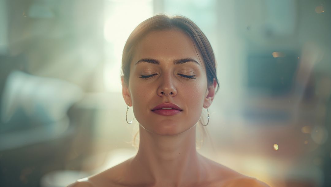 - Calm Woman Meditating with Sunlit Ambiance in Lounge