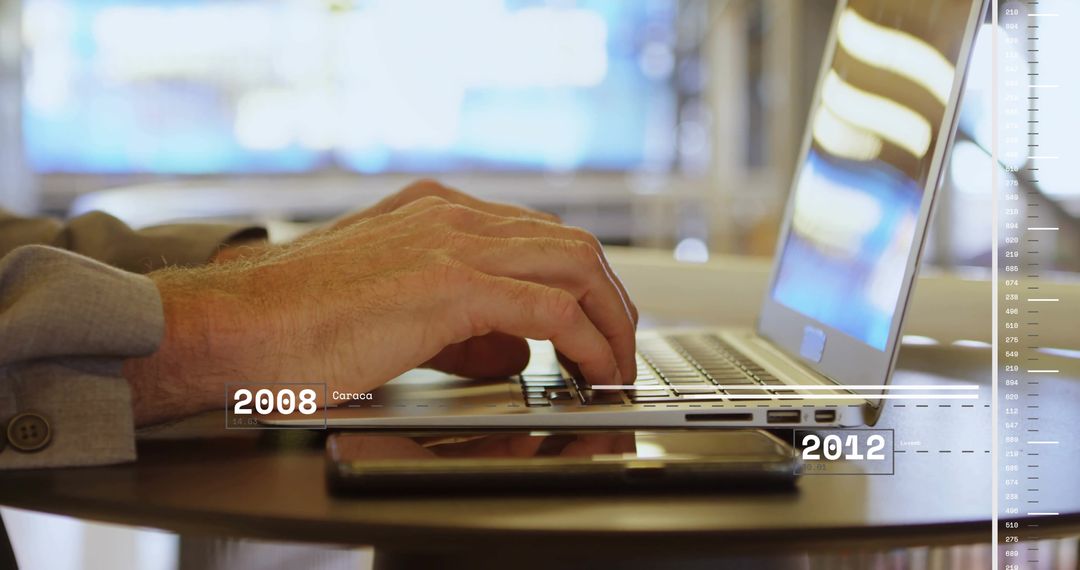 Features focused hands of a Caucasian businessman working on a laptop, interpreting financial data and global trends superimposed over the scene. Ideal for illustrating concepts in financial analysis, corporate communications, digital transformation, and global business operations.