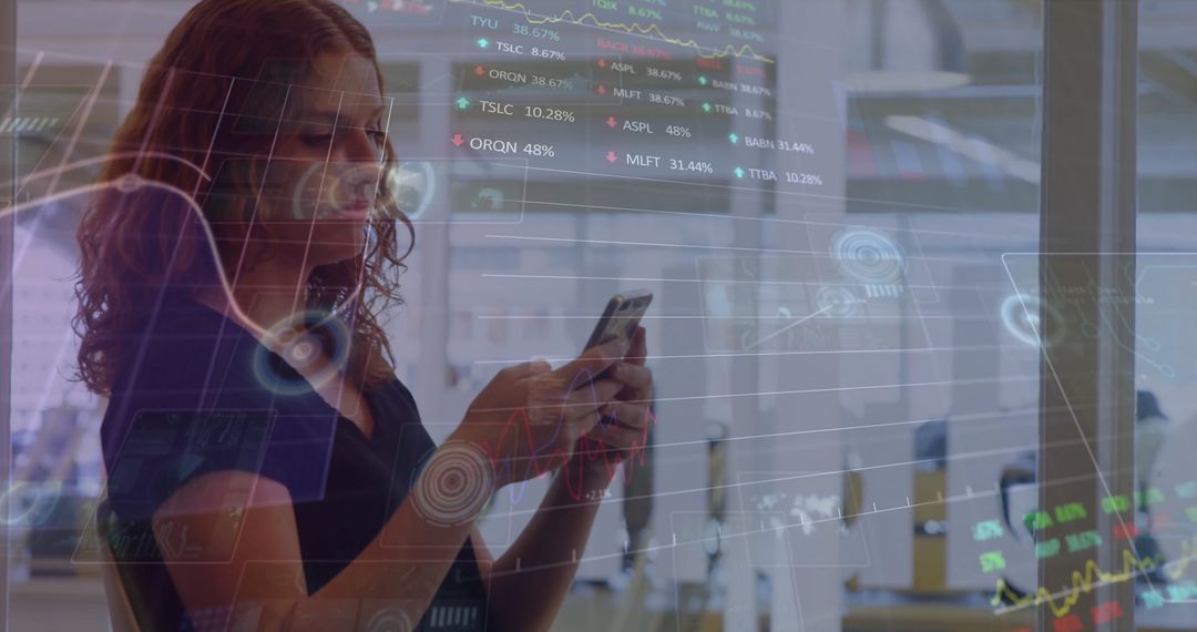 Businesswoman analyzing financial data on smartphone, showcasing use of technology in global finance. Concepts like digital finance, stock market analytics, and data processing are represented, making it suitable for illustrating modern finance, tech integration in business, and online data analysis.