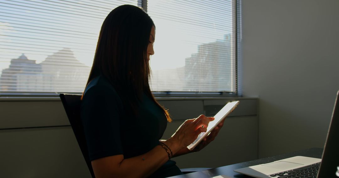 Professional Caucasian businesswoman using digital tablet in modern office environment. Image features side view of woman concentrating on tablet while natural light streams through window blinds. Ideal for illustrating concepts of modern technology, business environments, remote work, and professional demeanor.