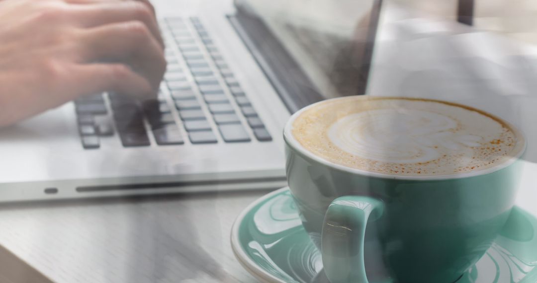 Hands typing on a laptop with a focus on the latte, suggesting a casual and comfortable workspace environment. Ideal for articles or advertisements related to remote work, freelancing, or computer-based tasks. Can be used by blogs or businesses focusing on productivity, work-life balance, or enhancing office settings with comfortable atmosphere.