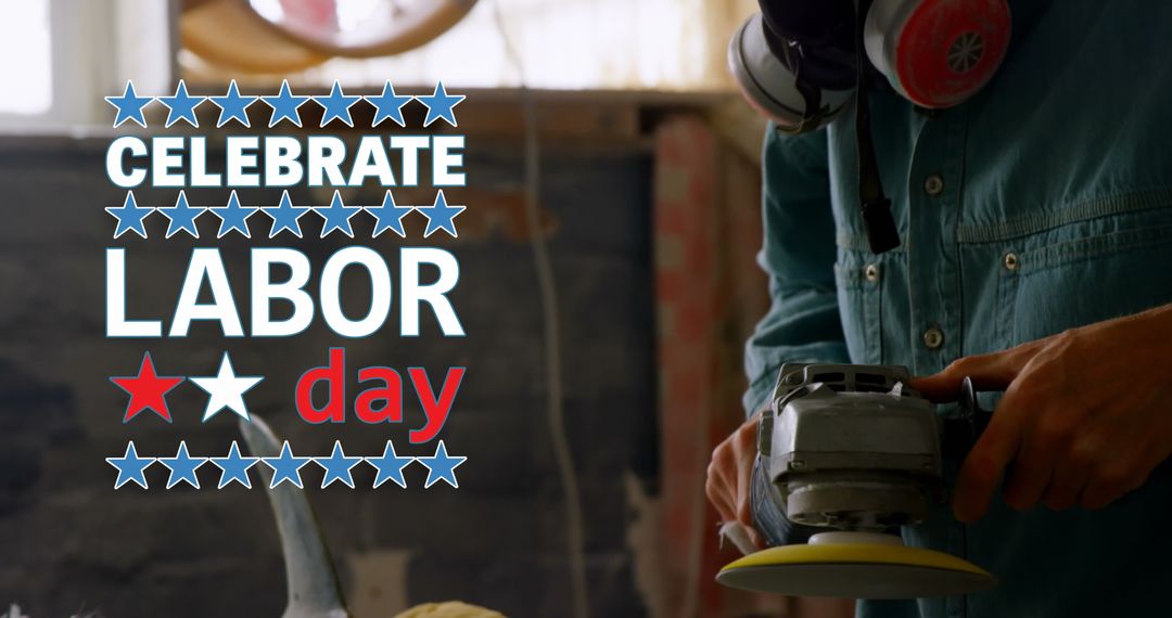 Labor Day theme with a focus on a carpenter working in a workshop, creatively utilizing typography with patriotic elements like stars and stripes. Ideal for promotions and advertisements related to Labor Day sales, events highlighting craftsmanship, or content celebrating workers' dedication and skill in industrial settings.