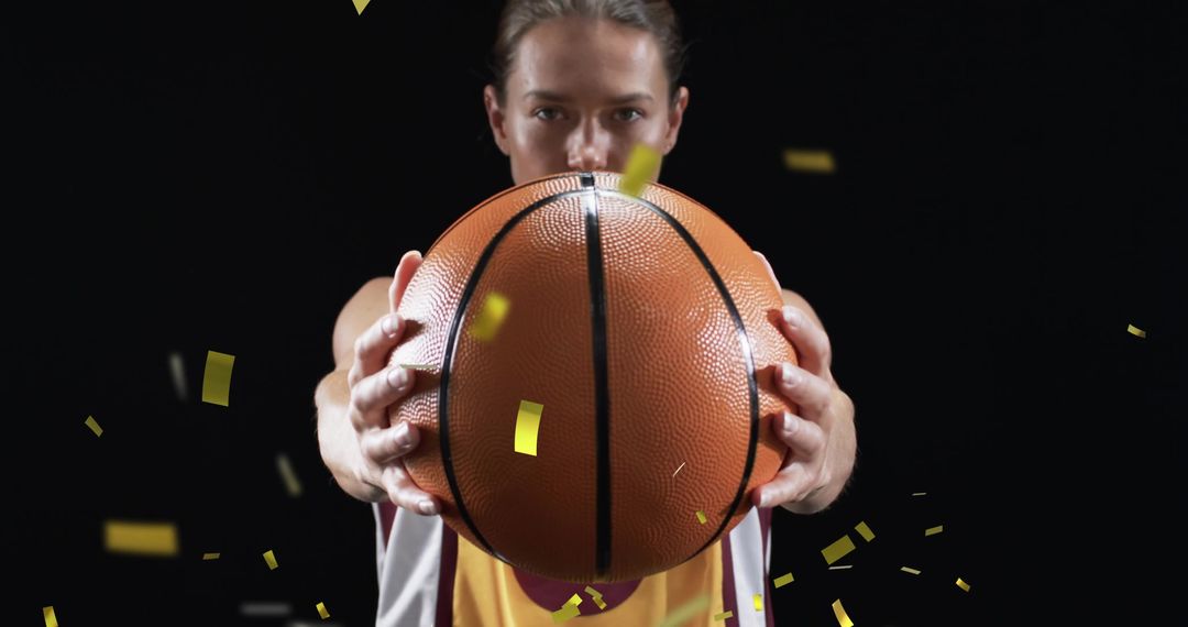 Image features a confident female basketball player holding a basketball, with falling confetti signifying celebration. It conveys themes of victory and achievement, ideal for sports coverage, motivational content, and promotions related to basketball events.