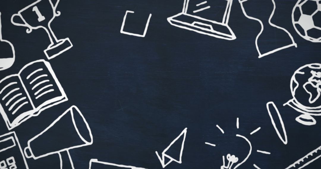Playful chalkboard art featuring hand-drawn education-related icons such as a trophy, laptop, soccer ball, and globe offers ample space for text in the center. Perfect for educational presentations, school promotional materials, online learning platforms, or as a background for teaching content aimed at students.