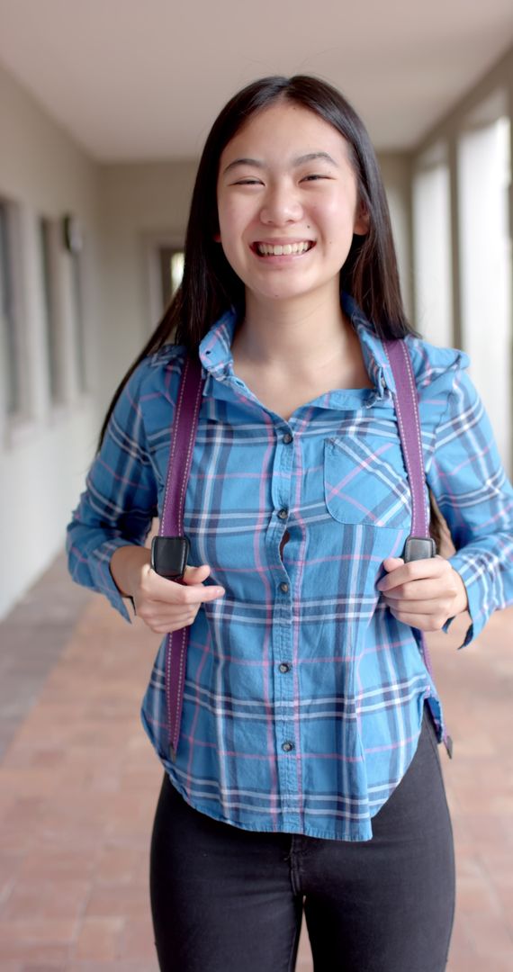Smiling Asian high school student stands with her backpack, symbolizing enthusiasm and positivity toward education. Her casual outfit and bright expression suggest excitement and readiness for new learning experiences. Ideal for use in educational materials, promotional content aimed at school environments, and articles on student life.