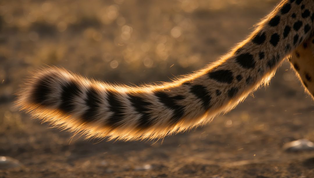 AI Generated Image. Close-up of a cheetah tail lit during golden hour. Blurred dry ground adds depth and warmth. Perfect for use in wildlife photography collections, nature studies, or educational content about the African savannah. Useful for highlighting animal anatomy and diverse wildlife scenes.