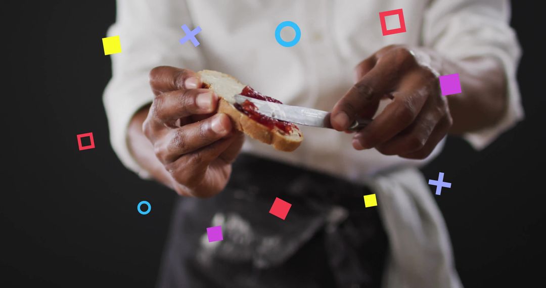 The image shows a chef confidently spreading vibrant red jam on a slice of bread against a dark background. He is wearing a white shirt and a black apron, skillfully applying the spread with a knife. The scene is animated with colorful geometric shapes, adding an artistic flair to the culinary process. This image is ideal for use in cooking blogs, culinary magazines, or creative food-related marketing materials, highlighting gourmet expertise or innovative presentations in the kitchen.