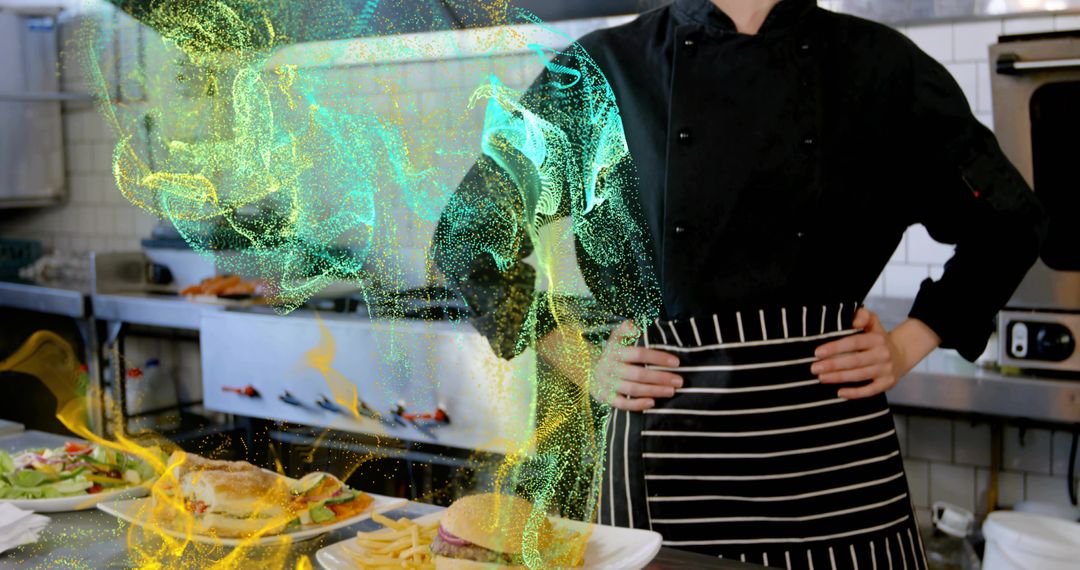 - Chef presenting gourmet burgers with colorful particle swirl in commercial kitchen