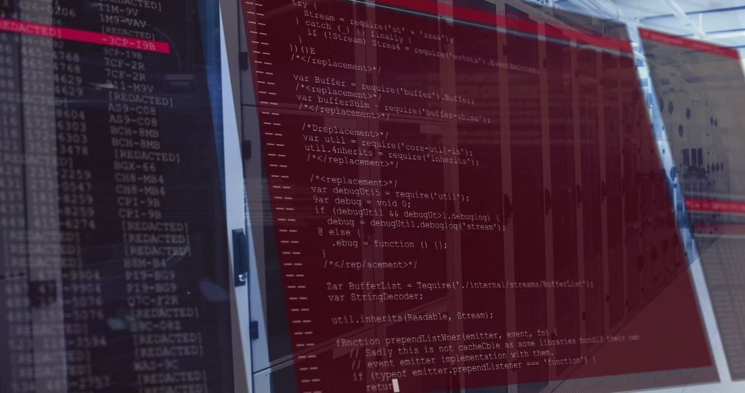 Digital screen displaying JavaScript code editor inside data center showcases cybersecurity themes and software development process. Excellent for technology-related articles, blog posts on coding habits or attention to digital security features, underscores the backdrop of server infrastructure. Effective for presentations about network security, programming tutorials, or illustrating software engineering environments.