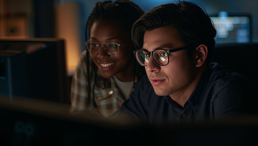 AI Generated Image. Two young professionals collaborating over code on dual monitors in low-light tech workspace. Male developer wearing glasses focusing on screen with code reflected in lenses while female colleague smiling and observing. Warm desk lamp and cool monitor light creating moody contrast and highlighting facial expressions. Scene conveying teamwork, concentration, problem solving, pair programming and mentoring. Ideal for technology marketing, software development blog posts, startup pitch decks, online course thumbnails, recruitment campaigns for engineers, UX or UI case studies and cybersecurity articles. Useful for website hero banners, social media ads, slide presentations and newsletter headers. Composition allowing for headline or call-to-action overlay in blurred foreground or negative space.