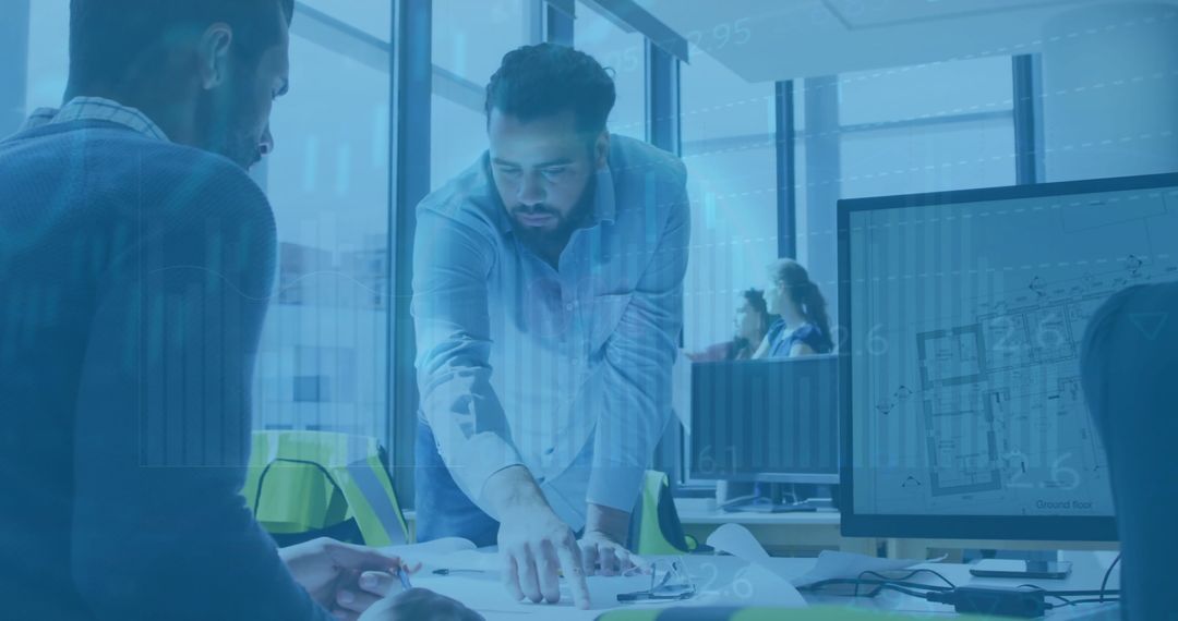 - Collaboration in Modern Business Office with Digital Financial Overlay