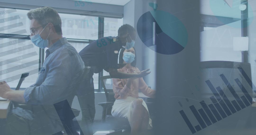 Colleagues wearing face masks engage in a collaborative discussion in a modern office setting, with layers of financial graphs and data projected overlayed. This portrays a contemporary work environment adjusting to pandemic constraints, emphasizing the significance of health safety and technological integration in engaging with complex quantitative insights. Perfect for illustrating topics in finance, teamwork adaptation during COVID-19, and the use of digital tools in business operations.