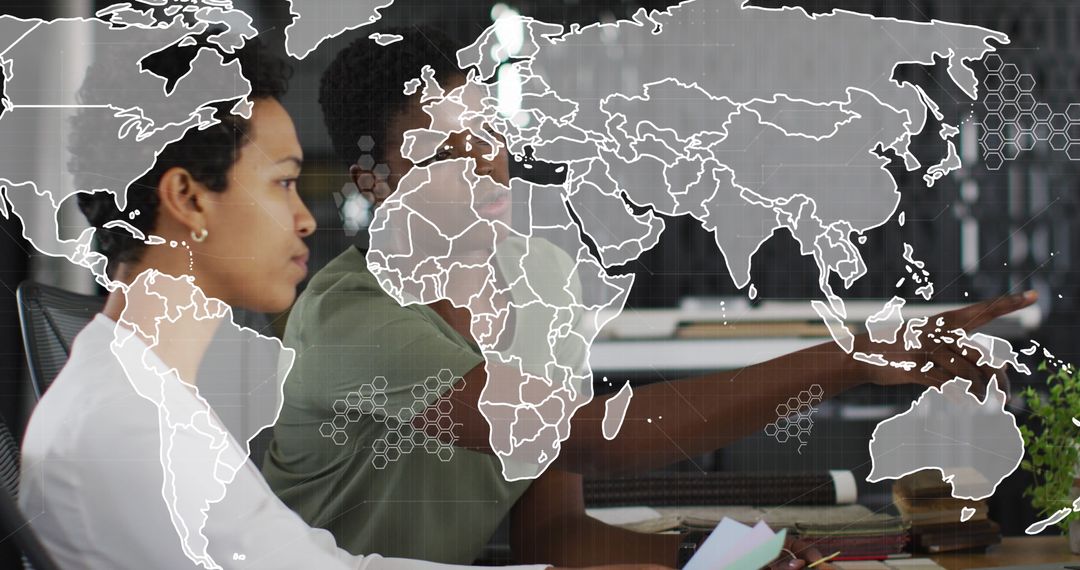 Diverse professionals working together in an office environment with a digital world map overlay. Suitable for illustrating global business concepts, innovative teamwork, or multicultural collaboration in digital presentations, marketing materials, and corporate publications.